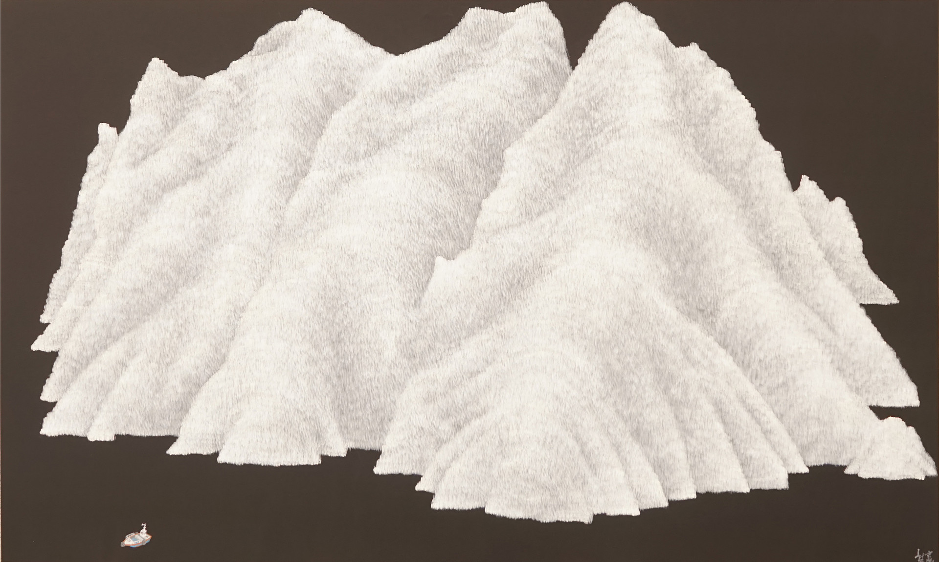 Artist Jung Cheol (Tony Iron Jung) paints and completes mountains by repeatedly writing the Chinese character 山 (san) — meaning “mountain” — millions of times with an extremely fine brush on samhap jangji (traditional Korean mulberry paper). It is a process that requires extreme concentration and patience, a practice that can be called a form of spiritual training in itself.